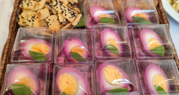 2 nap múlva a levet leöntöttem, a tojásokat felszeleteltem. Gyönyörű színt kaptak. Tálaláskor fermentált rukkola levelekből tekert fészekre ültettem.