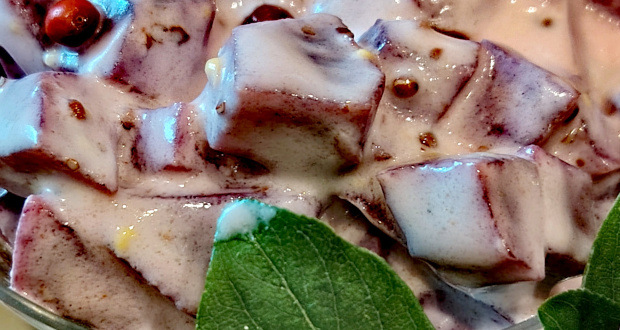 3. Elkészítettem hozzá az öntetet: a joghurtot összekevertem a majonézzel, a mustárral és a citromlével. Összeforgattam a kihűlt édesburgonyával, tálaláskor néhány szem piros borssal díszítettem.