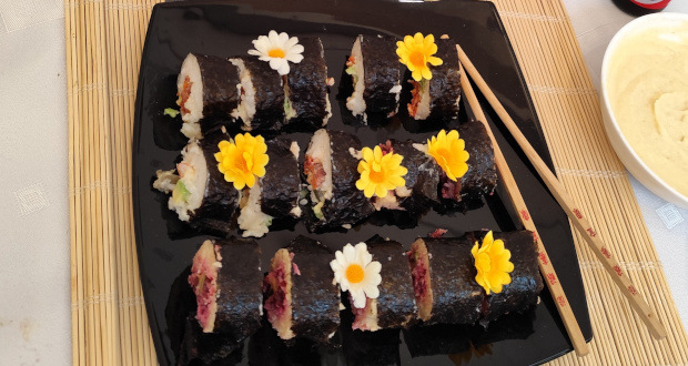 Ugyanúgy készül, mint a halas változat, két alapanyag kivételével. Hal helyett beléből kiszedett, puha kolbászhúsból (gyulait ajánlom) készült vékony rudacskákkal töltjük, és Cseh Teca-féle fermentált karfiolmajonézzel kenjük meg.